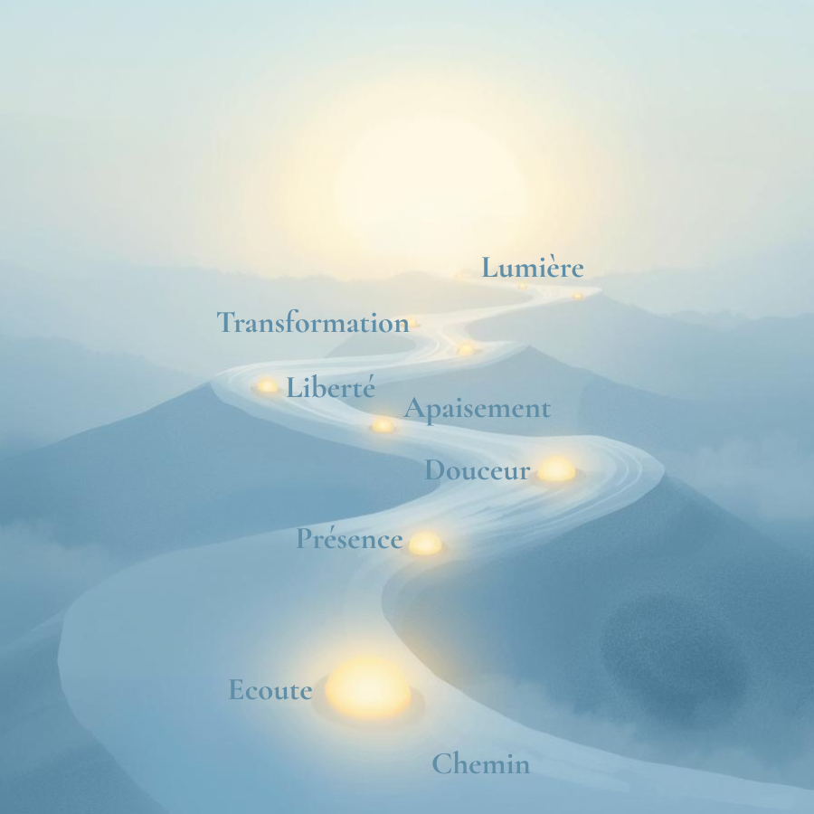 Chaque étape est une rencontre, un espace où vous pouvez déposer vos émotions, vos doutes, vos colères, vos larmes ou vos élans de vie. Un espace pour respirer, pour accueillir ce qui est, et petit à petit retrouver un apaisement intérieur. Ensemble, nous définirons dès le départ la fréquence qui vous convient : cela peut être rapproché, si vous ressentez le besoin d’un soutien plus présent, ou plus espacé, si vous préférez avancer tranquillement. Vous gardez toujours la liberté de votre rythme.Ces 8 séances vous offrent :